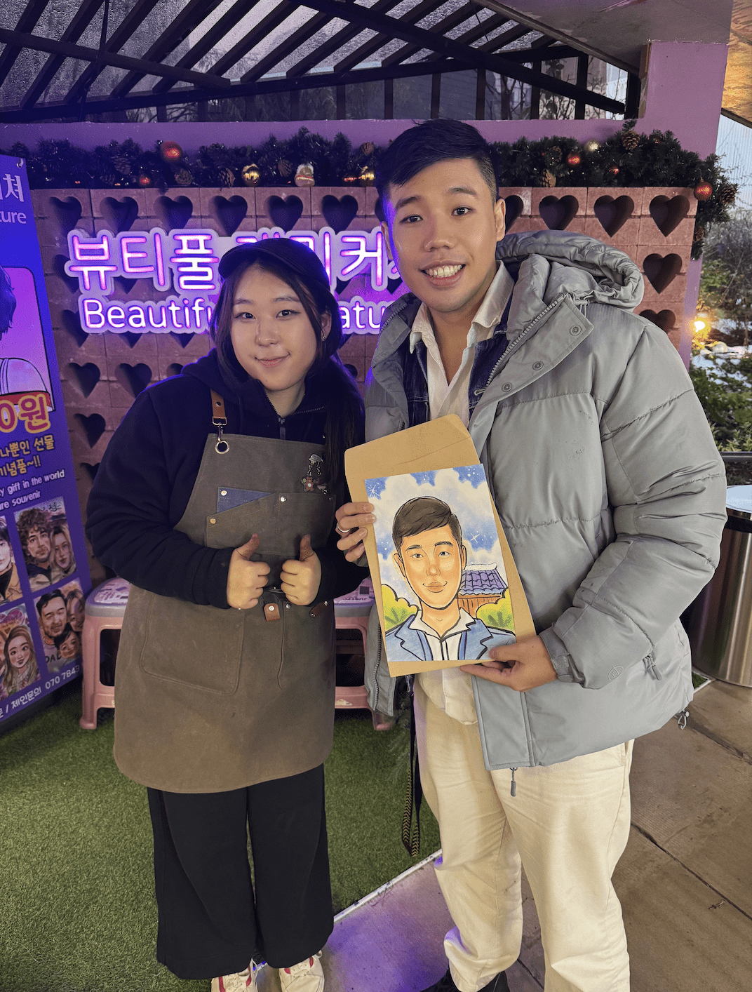 Later that day, I stumbled upon a small setup where artists captured moments through caricatures.